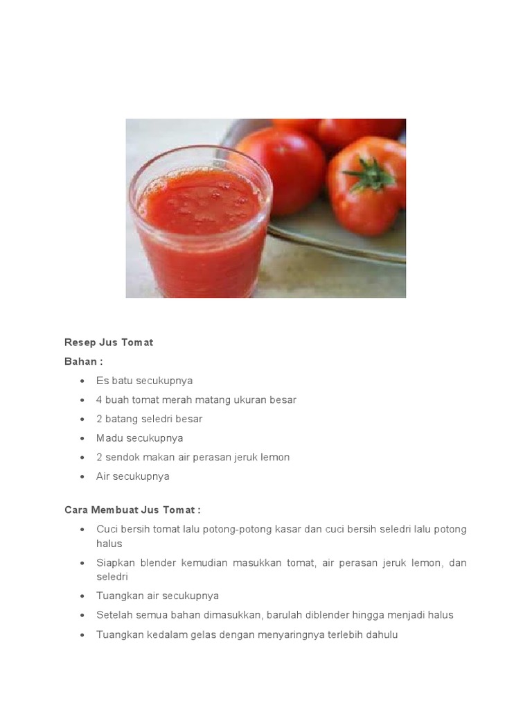 Lihat juga manfaat kesehatan yang akan anda peroleh dari minum jus tomat. #resep #dapur #memasak #masakan #makanan #minuman. Oke simak resep jus tomat yang sehat berikut ini. Berbagai resep dalam artikel ini mungkin bisa jadi bagi jus mangga ke dalam dua wadah yang berbeda.